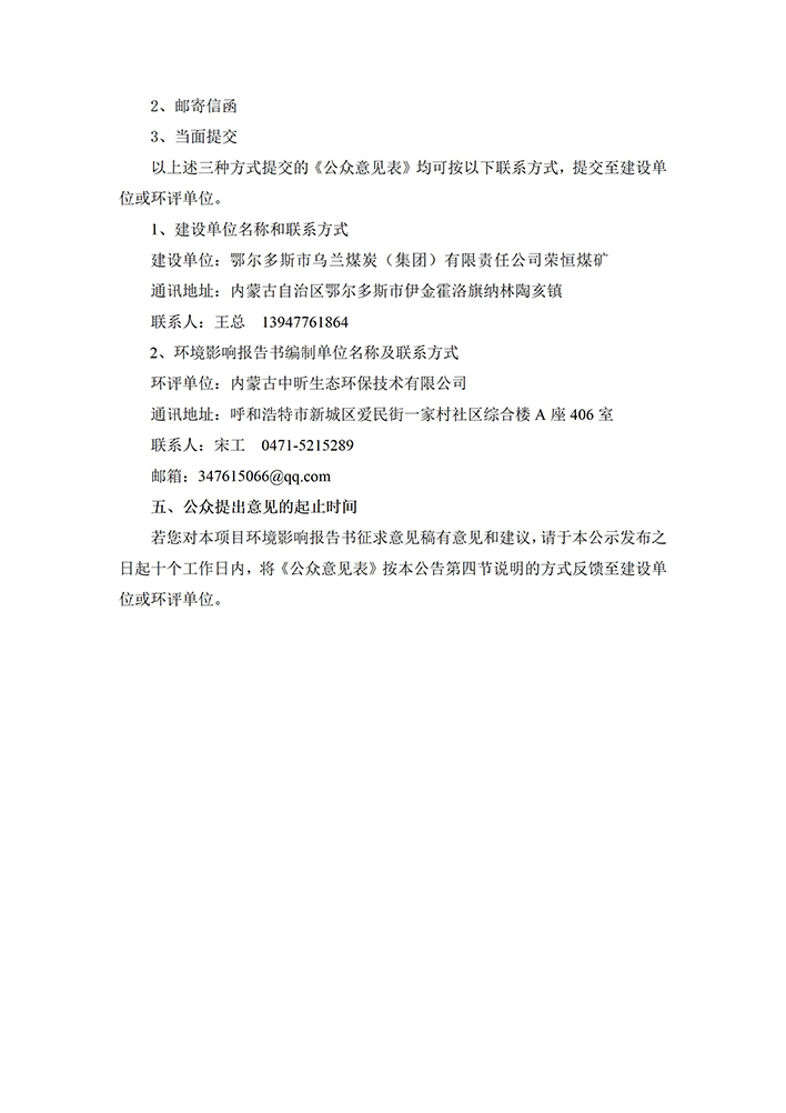 鄂尔多斯市乌兰煤炭(集团)有限责任公司荣恒煤矿扩大露采范围项目环境影响评价第二次公示